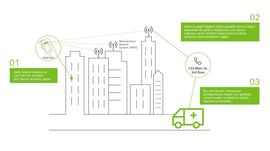Bosch ve 3D coğrafi konum servis sağlayıcısı NextNav LLC, bileşen özellikleri ve sistem performansı üzerinde iş birliği yaparak iç mekanlarda tutarlı, yüksek z-ekseni hassasiyeti sağladı. Bu, telefona yerleştirilen Bosch BMP390 barometrik basınç sensörlerinin, NextNav’ın 3 boyutlu konum bildiren Metropolitan Beacon Sistemi (MBS) z ekseni hizmetiyle birleştirilmesi sonucunda gerçekleştirildi.
