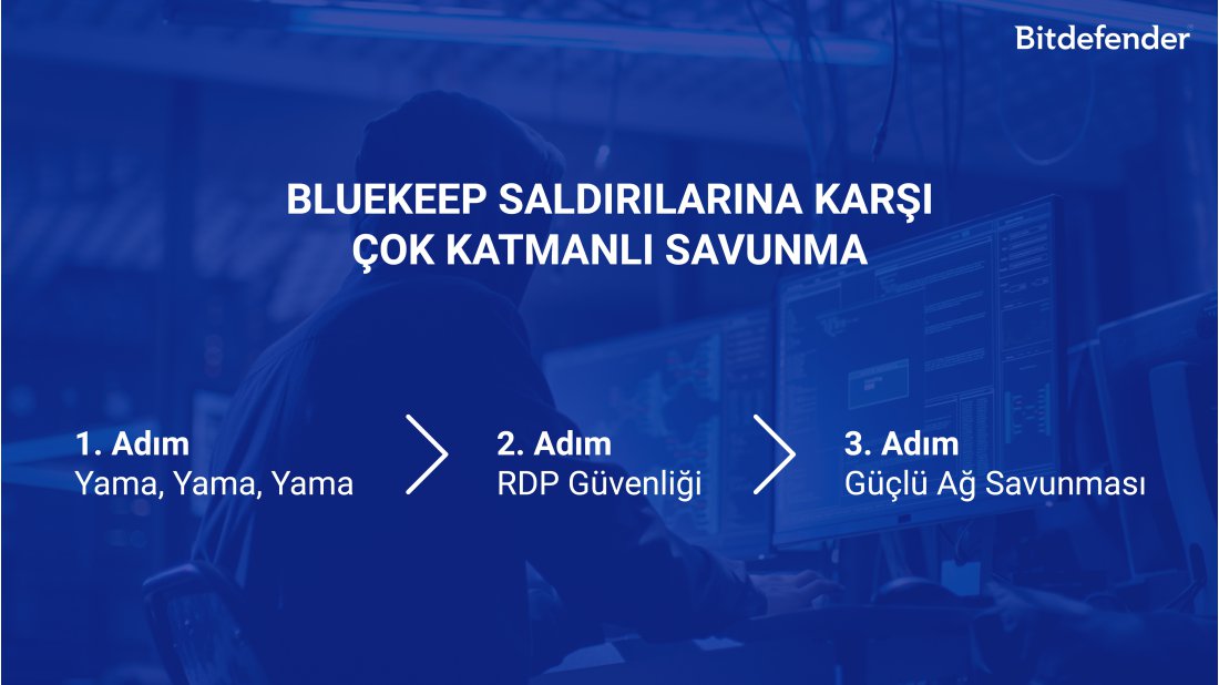 İlk olarak 2019 Mayıs ayında Microsoft tarafından duyurulan BlueKeep güvenlik açığı, 2017 yılındaki geniş WannaCry saldırısını tetikleyen ünlü EternalBlue ile çarpıcı bir benzerlik gösteriyor. BlueKeep açığı, hedeflenen sistemlerde uzaktan kod çalıştırılmasını tetiklemek, ardından fidye yazılımı veya şifreleme gibi kötü amaçlı yazılımları yüklemek veya bilgisayar korsanlarının kalıcılık oluşturmalarını sağlamak için kullanılıyor. Güvenlik açığının solucan benzeri yetenekleri de etkinleştirebildiğine ve bu durumun sızılan ağ içinde hızla yayılmasına yardımcı olduğuna dikkat çeken Bitdefender Antivirüs, kullanıcıların BlueKeep saldırısına karşı önlem almaları gerektiğini belirtiyor.