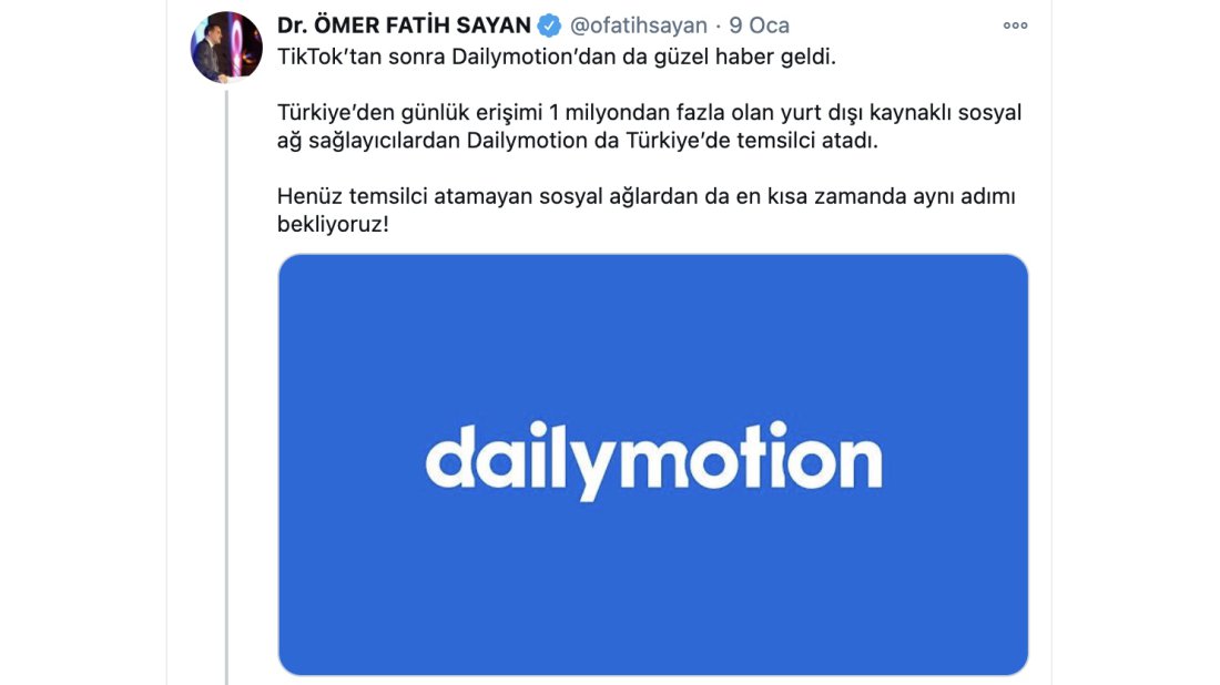 VK, YouTube ve TikTok’un ardından Dailymotion da Türkiye’ye temsilci atama kararı aldı. Gelişmeyi, Ulaştırma ve Altyapı Bakan Yardımcısı Ömer Fatih Sayan, sosyal medya hesabından duyurdu. Sayan, mesajında şunları aktardı: “TikTok’tan sonra Dailymotion’dan da güzel haber geldi. Türkiye’den günlük erişimi 1 milyondan fazla olan yurt dışı kaynaklı sosyal ağ sağlayıcılardan Dailymotion da Türkiye’de temsilci atadı. Henüz temsilci atamayan sosyal ağlardan da en kısa zamanda aynı adımı bekliyoruz!”