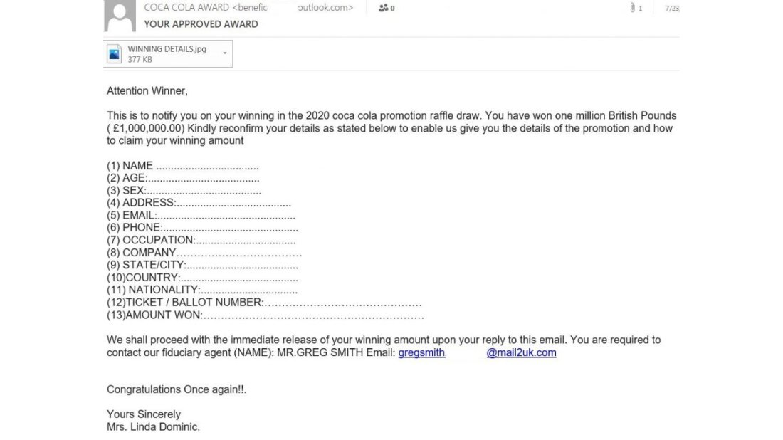 Dolandırıcılar oltalama e-postasının içeriğinde "Bu e-posta, 2020 Coca Cola promosyon çekilişini kazandığınızı size bildirmek için gönderildi. Bir milyon İngiliz Sterlini (1.000.000,00 £) kazandınız. Size promosyonun ayrıntılarını ve kazandığınız miktarı nasıl talep edeceğinizi iletmemiz için aşağıda belirtildiği gibi bilgilerinizi tekrar teyit edin." ifadelerine yer veriyor.