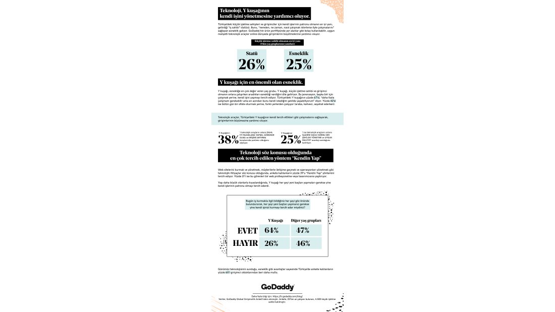 GoDaddy Global Girişimcilik Anketi’nin sonuçlarına göre Türkiye’deki küçük işletme sahipleri ve girişimcilerin (tüm yaş grupları) yüzde 25’i kendi işinin patronu olmanın en iyi yanının sağladığı “esneklik” olduğunu belirtti. Kendi işinin patronu olmanın en iyi yanının getirdiği “işletme sahibi” statüsü olduğunu belirtenlerin oranı ise yüzde 26 idi. Farklı yaş gruplarının yanıtlarına bakıldığında, Y kuşağının esnekliğe en çok önem veren grup olduğu görülüyor.