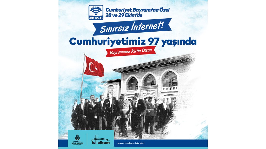İstanbul Büyükşehir Belediyesi, Cumhuriyet’in 97. yıl dönümü sebebiyle, 28 ve 29 Ekim günlerinde İstanbullular için kotaları kaldıracak. İstanbullular, Cumhuriyet Bayramı ve bir gün öncesinde İBB Wi-Fi hizmetinden sınırsız olarak faydalanabilecek.
