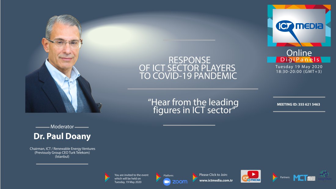 ICT MEDIA tarafından gerçekleştirilen Online Buluşmalar’da bu hafta bir ilk yaşanacak. Sektörün küresel oyuncuları, internet üzerinden gerçekleştirilecek online dijital panelde “Bilgi ve İletişim Teknolojileri Sektörü Oyuncularının Covid-19 Salgınına Yanıtları”nı ele alacak. Moderatörlük koltuğuna ise sürpriz bir isim, Türk Telekom’un bir önceki Grup CEO’su Dr. Paul Doany oturacak. Doany’nin İstanbul’dan yöneteceği dijital panele Telecom Italia Group- Sparkle CEO’su Mario Di Mauro Roma’dan, DE-CIX International CEO’su Ivo Ivanov Frankfurt’tan ve Rahi Systems CEO’su Tarun Raisoni Kaliforniya’dan panelist olarak katılacak.