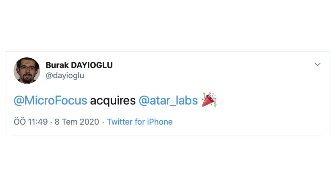 İngiltere merkezli kurumsal yazılım devi Micro Focus, yerli siber güvenlik girişimi ATAR Labs'ı satın alıyor. Satın alma işlemini Atar Labs kurucu ortağı Burak Dayıoğlu attığı bir tweetle duyurdu. Dayıoğlu, satın alma işleminin detayları hakkında ise bilgi vermedi.