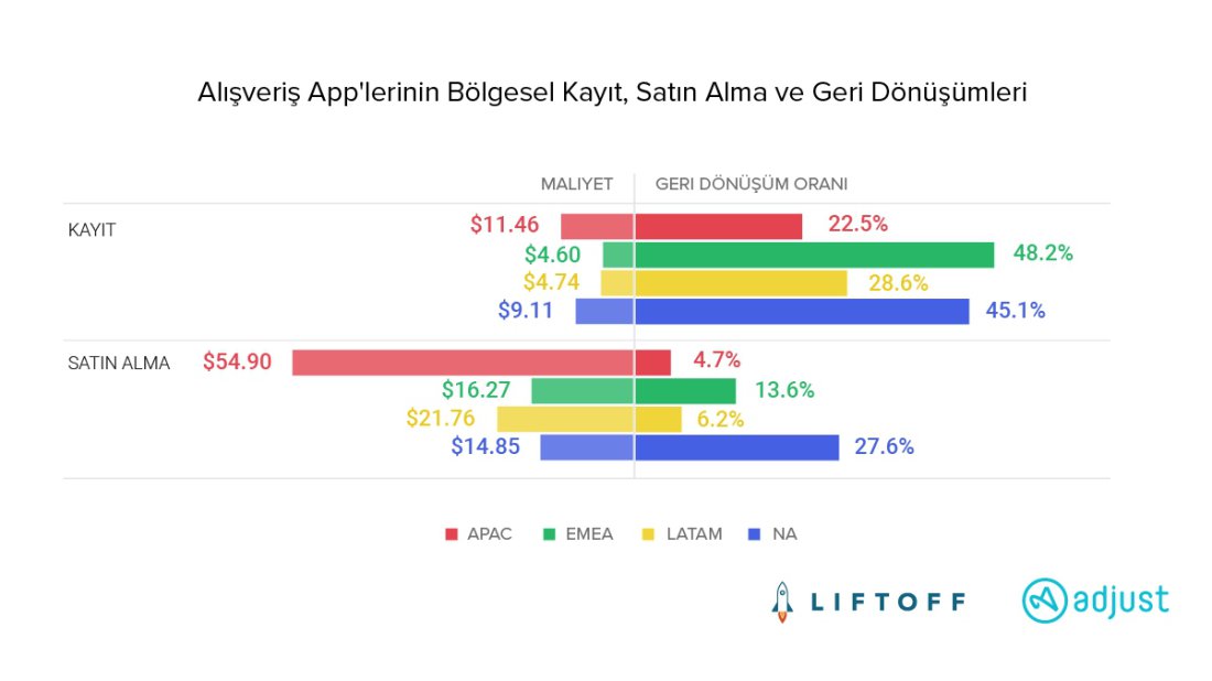 Alışveriş uygulamalarının büyümeleri dünya çapında hızla devam ederken, Kuzey Amerika açıkça lider konumunda: bu bölgedeki ilk satın alma maliyeti 14.85 dolar gibi düşük bir seviyeye kadar dört kat azalırken, dönüşüm oranları dört kat arttı ve %27.6 seviyesine ulaştı.