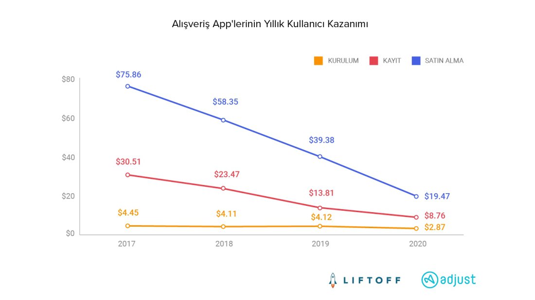 Liftoff ve Adjust'ın analizleri, alışveriş uygulamalarının kullanıcı sayısının arttığına işaret ediyor. İlk alışverişini tamamlayan bir kullanıcıyı kazanmanın maliyeti 19.47 dolar seviyesinde ve bu rakam yıllık bazda yarıdan fazla düşmüş durumda. Ayrıca etkileşimler %40 arttı ve geçen yıl %10.5 olan satın alma oranı bu yıl %14.7'ye yükseldi.