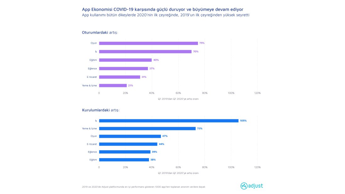 Salgın hastalık nedeniyle, evden çalışan kişi sayısının artması ve bunun bir zorunluluk haline gelmesi nedeni ile iş uygulamalarının kullanımında (2019'un ilk çeyreğine göre %105) ve yeni uygulama indirmelerde (%70) çok büyük bir artış görülüyor. Evden çalışmayı daha kolaylaştırmak amacıyla kullanıcılar, uygulamaların ücretli versiyonlarını tercih ettiklerinden, ciroya katkı sağlayan uygulama-içi hareketler de %75 oranında arttı.