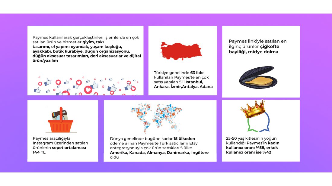 İki yıl içerisinde Paymes sistemi üzerinden işlem bazlı bilgilerin de paylaşıldığı açıklamada önemli ve dikkat çekici noktalar bulunuyor. 25-50 yaş kitlesinin yoğun kullandığı Paymes’in kadın kullanıcı oranı %58 ve erkek kullanıcı oranı %42 iken uygulama Türkiye genelinde 63 ilde kullanılıyor. Paymes üzerinden en çok satış yapılan illerin başında ise İstanbul, İzmir, Ankara, Antalya ve Adana geliyor. Paymes aracılığıyla sosyal medya üzerinden yapılan alışveriş ödemelerinin %13’ü taksit seçeneği ile gerçekleştirilirken en çok satılan ürün ve hizmetlerin; giyim, takı tasarımı, el yapımı oyuncak, yaşam koçluğu, ayakkabı, butik kurabiye, düğün organizasyonu, düğün aksesuar tasarımları, deri aksesuarlar ve dijital ürün/yazılım olduğu görülüyor. Çiğköfte bayiliği ve midye dolma ise Paymes linkiyle satılan en ilginç ürünler olarak karşımıza çıkıyor.