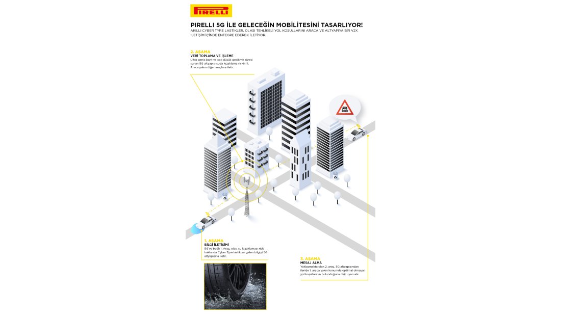 Araç ile yol arasındaki tek bağlantı noktası olan lastikler, Pirelli'nin mükemmelleştirdiği teknoloji sayesinde araç ve şoförle, 5G potansiyeli sayesinde de tüm yol altyapısıyla iletişim kurmayı başardı. İçinde bir sensör bulunan Pirelli Cyber Tyre, gelecekte lastik modeli, kat edilen kilometre, dinamik yük ve bir ilk olarak su birikintilerinden zayıf kavramaya kadar yol yüzeyindeki olası tehlike durumları gibi verileri otomobile iletecek. Bu bilgiler otomobilin kontrol ve sürüş destek sistemlerini adapte etmesini, güvenlik, konfor ve performans seviyesini ciddi ölçüde geliştirmesini sağlayacak. Aynı bilgiler, diğer otomobillere ve altyapıya da iletilecek. Pirelli, 5G'nin potansiyeli sayesinde lastiği karayolu ulaşım ekosisteminin tamamını kapsayan daha geniş bir iletişim bağlamında konumlandırabilecek ve geleceğin mobilite ve otonom sürüş sistemleri için çözüm ve hizmetlerin geliştirilmesine aktif olarak katkıda bulunabilecek.