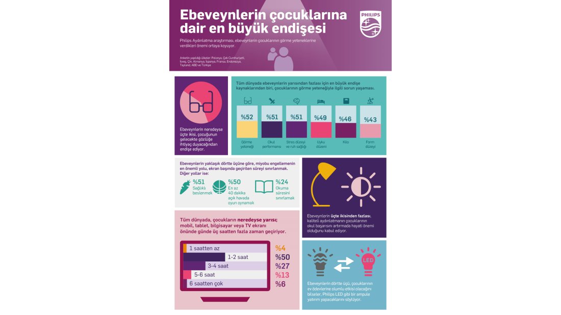 Türkiye'de ebeveynler çocuklarının görme yeteneği hakkında (%49) kaygı duyuyor. Bu oran, beden sağlığı (%17), cilt sağlığı (%26), genel enerji düzeyleri (%44) ve diğer çocuklarla kaynaşma (%45) konularındaki ebeveynlere ait kaygılarından daha yüksek seviyede bulunuyor.