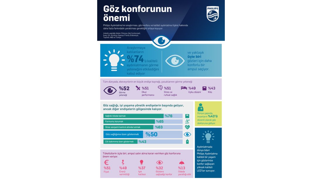 Eski ismiyle Philips Lighting yeni ismiyle Signify EyeComfort araştırmasıyla aydınlatmanın göz konforu üzerindeki etkilerini masaya yatırıyor. Araştırma, Polonya, Çek Cumhuriyeti, İsveç, Çin, Almanya, İspanya, Fransa, Endonezya, Tayland, ABD ve Türkiye’den oluşan 11 pazarda 8.000’den fazla katılımcı ile gerçekleştirildi.