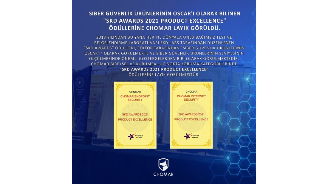 CHOMAR; bireysel ve kurumsal uç nokta koruma kategorilerinde “SKD AWARDS 2021 PRODUCT EXCELLENCE” ödüllerine layık görüldü. Şirket CEO’su S. Bilgehan Üstündağ “Ülkemiz için yine bir ilki gerçekleştirmenin gururunu yaşıyoruz, %100 yerli teknoloji ile Türkiye’de geliştirmiş olduğumuz CHOMAR siber güvenlik ürünleri ile ülkemizi uluslararası arenada başarı ile temsil etmeye devam ediyoruz. Bireysel ve Kurumsal Uç Nokta Koruma kategorilerinde SKD AWARDS ürün mükemmeliyet ödülünü 2 yıl üst üste alan Türkiye'de ilk ve tek, globalde ise sayılı şirketler arasındayız. Geliştirmiş olduğumuz siber güvenlik ürünlerinin kalitesini global olarak pekiştirmeye devam ederken, yüksek teknolojili siber güvenlik ürünleri ile dijital dünyada güvende kalmanızı sağlamaya devam edeceğiz. Ayrıca müşterilerimize en iyi uç nokta koruma ürünlerini sunma taahhüdümüzü sürdürürken, koleksiyonumuza yeni ödülleri de eklemekten gurur duyuyoruz.” dedi.