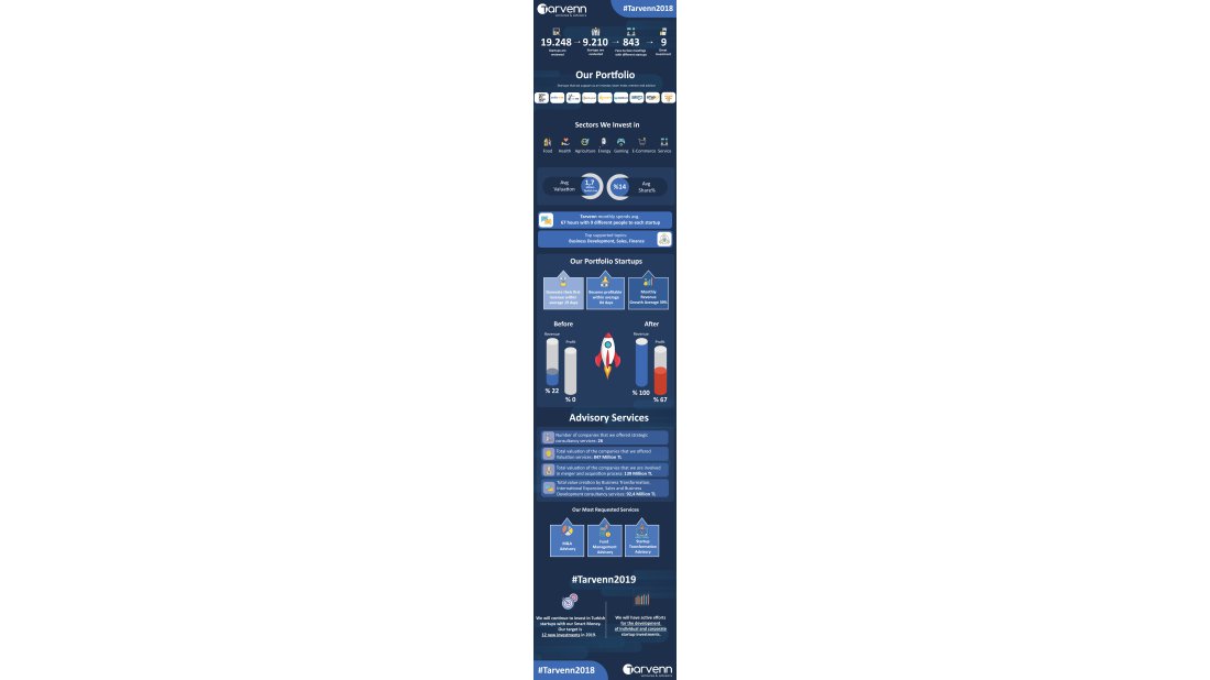 2018 yılında her sektörden 19.248 girişimi inceleyen ve 9.210 girişimi değerlendirmeye alan Tarvenn, 843 farklı girişim ile yüz yüze görüşme yaptı. 9 girişime yatırım kararı alan Tarvenn Ventures; gıda, sağlık, tarım, enerji, oyun, e-ticaret ve hizmet sektörlerinde faaliyet gösteren geniş bir girişim portföyü oluşturdu. Yatırım yapılan girişimlerin ortalama değerlemeleri 1,7 milyon TL olurken, ortalama hisse oranı ise %14 olarak açıklandı.