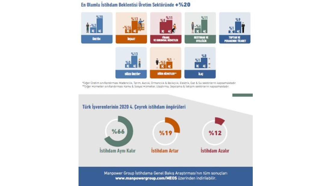 ManpowerGroup İstihdama Genel Bakış Araştırması'na göre araştırma kapsamında yer alan sekiz sektörün tamamında dördüncü çeyreğe yönelik istihdam artışı beklentisi hakim olurken, Üretim sektörü mevsimsel verilerden arındırılmış +%20 istihdam görünümüyle bu sektörler arasında en olumlu istihdam beklentisi gösteren sektör oldu. İstihdam beklentisi bir önceki çeyreğe kıyasla yüzde 13 puan, bir önceki yılın aynı dönemine kıyasla da yüzde 5 puan artış gösterdi. Türkiye bu sonuçlarla dünyada dördüncü çeyrek için en olumlu istihdam görünümüne sahip üçüncü ülke oldu.