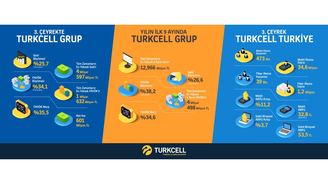 Turkcell, üçüncü çeyrek finansal sonuçlarında yüzde 25,7 büyümeyle 4,6 milyar lira gelir açıklayan Turkcell, toplam gelirde telekomünikasyon sektörünün lideri oldu. Müşteri bazındaki genişleme, dijital servisler ve artan data kullanımı, finansal büyümenin ana etkenleri arasında yer aldı. Turkcell gelirlerinin %67’si data ve dijital servislerden geldi. Dijital servislerdeki gelir büyümesi yıllık bazda %175’i buldu.
