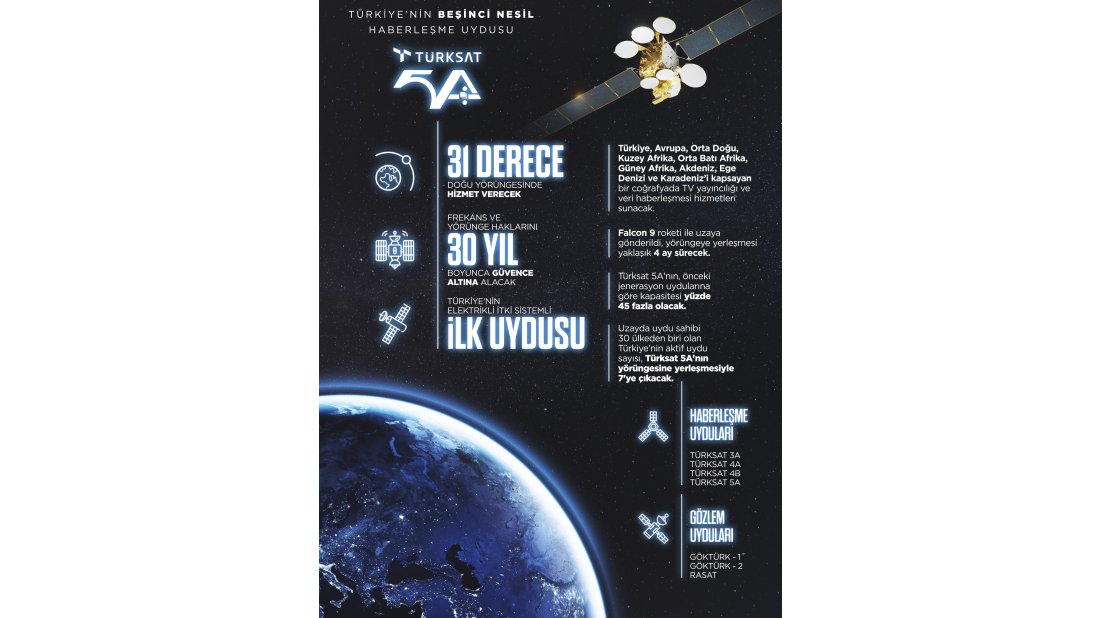 Cumhurbaşkanı Recep Tayyip Erdoğan, Türksat5A uydusunun fırlatılışı sonrası düzenlenen Uydu Teknolojileri Haftası özel oturumunda konuştu. TÜRKSAT 5A'nın kapsama alanında Avrupa, Orta Doğu, Kuzey ve Güney Afrika, Orta Afrika, Akdeniz, Ege ve Karadeniz'in bulunduğuna işaret eden Erdoğan, “Geniş bir hizmet alanına sahip bu uydumuzla aynı zamanda mevcut haberleşme uydularımızı da yedeklemiş oluyoruz. Türkiye uzayda yörünge hakkı bulunan 30 ülkeden biridir. Bu sabah uzaya fırlatılan TÜRKSAT 5A uydumuzla doğu yörüngesindeki uzay haklarımızı 30 yıl boyunca garanti altına alıyoruz. Yaklaşık 4 ay sonra yörüngesine yerleşecek olan uydumuzun ülkemize ve tüm dostlarımıza hayırlı hizmetlere vesile olacağına inanıyorum." dedi.