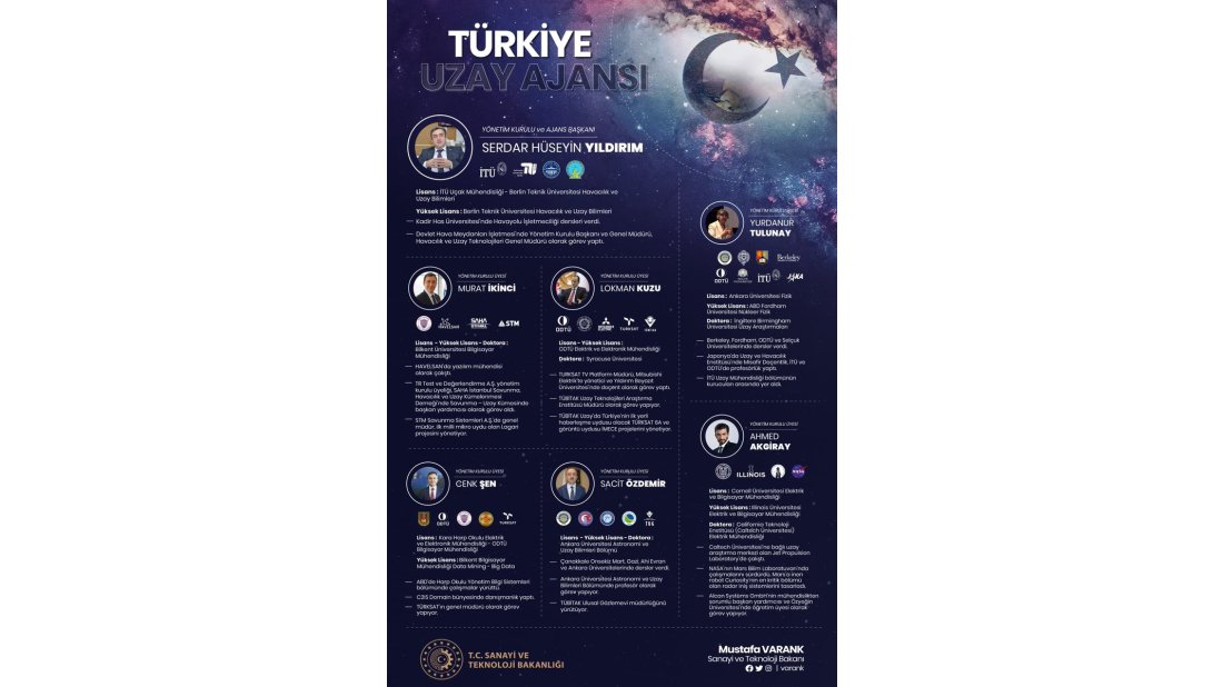 Türkiye Uzay Ajansı Başkanı ve Yönetim Kurulu Başkanı olarak Ulaştırma ve Altyapı Bakanlığı Havacılık ve Uzay Teknolojileri Genel Müdürü Serdar Hüseyin Yıldırım atandı. Yıldırım’ın da atanmasıyla beraber ajansın A Takımındaki isimler belli oldu. Ajansın kuruluş mevzuatına göre 3 sene görev yapacak olan 6 yönetim kurulu üyesi şu şekilde: Prof. Dr. Yurdanur Tulunay, Prof. Dr. Sacit Özdemir, Doç. Dr. Lokman Kuzu, Dr. Ahmed Halid Akgiray, Cenk Şen ve Murat İkinci getirildi.