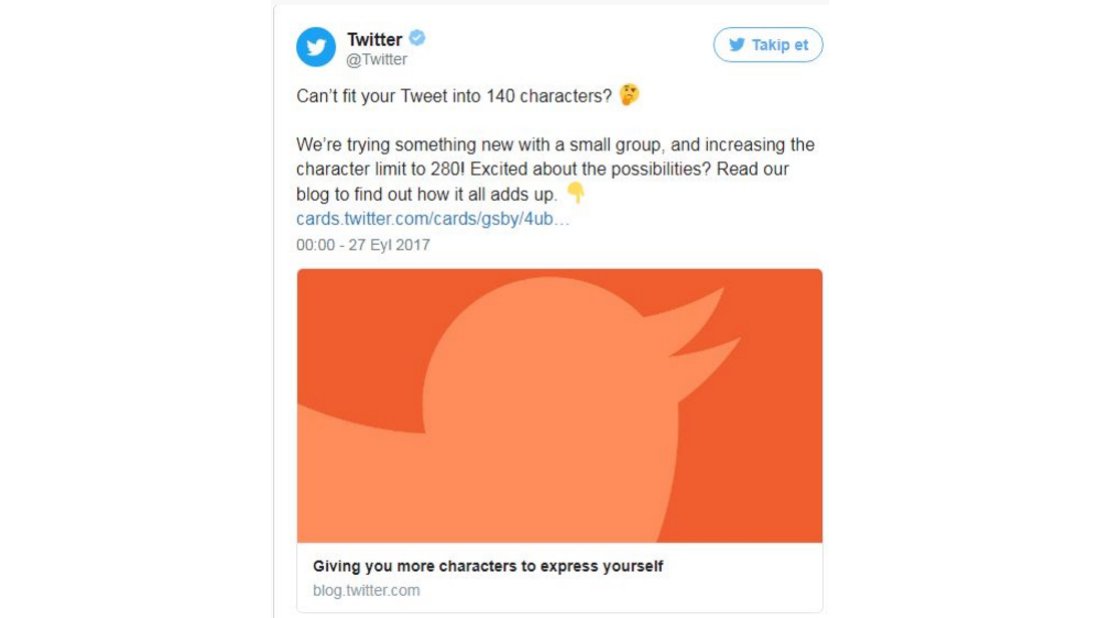 Popüler sosyal medya ağı Twitter, paylaşımlardaki "140" olan karakter limitini "280"e çıkaracağını bildirdi. Twitter, karakter sınırını iki katına çıkarma gerekçesini ise “kullanıcıların kendilerini daha rahat ifade edebilmesini sağlamak” olarak açıkladı.
