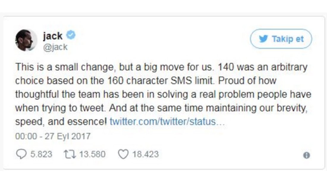 Twitter'ın kullanıcılarından Jack Dorsey ise "280" karakterlik ilk "tweet"i hesabından paylaştı: