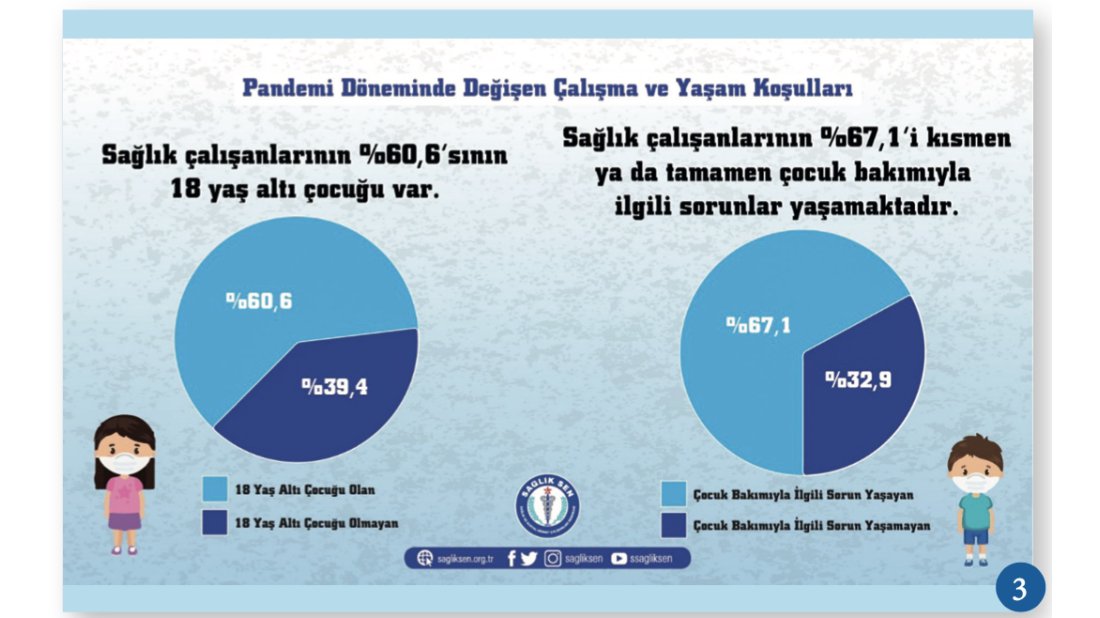 Bu süreçte küçük çocuğu olan sağlık çalışanları çocuklarının bakımıyla ilgili çözülmesi zor sorunlar yaşamışlar ve yaşamaktadırlar. Bulaş riskini ortadan kaldırmak için evine gidemeyen sağlık çalışanlarının bakmakla yükümlü bulundukları aile büyük ya da küçüklerinin bakımını kimin üstleneceği konusunda büyük bir çıkmaza girmişlerdir. Özellikle eşi de sağlık sektöründe olan sağlık çalı- şanları bu konuda daha da büyük sorunlar yaşamışlardır ki eşi sağlıkçı olanların oranı %36’dır.